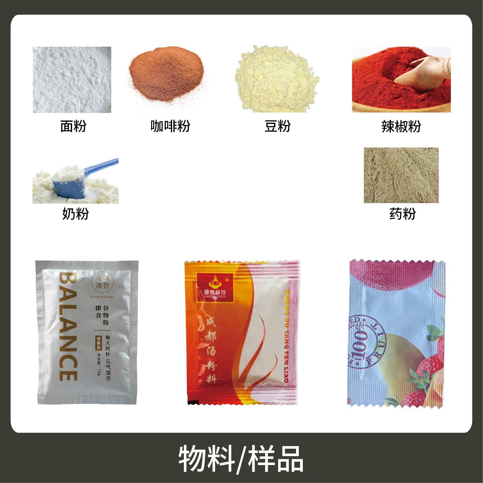 適用于食品、醫(yī)藥、化工、化妝品行業(yè)中粉劑物品的計量包裝,如:辣椒粉、咖啡粉、面粉等。