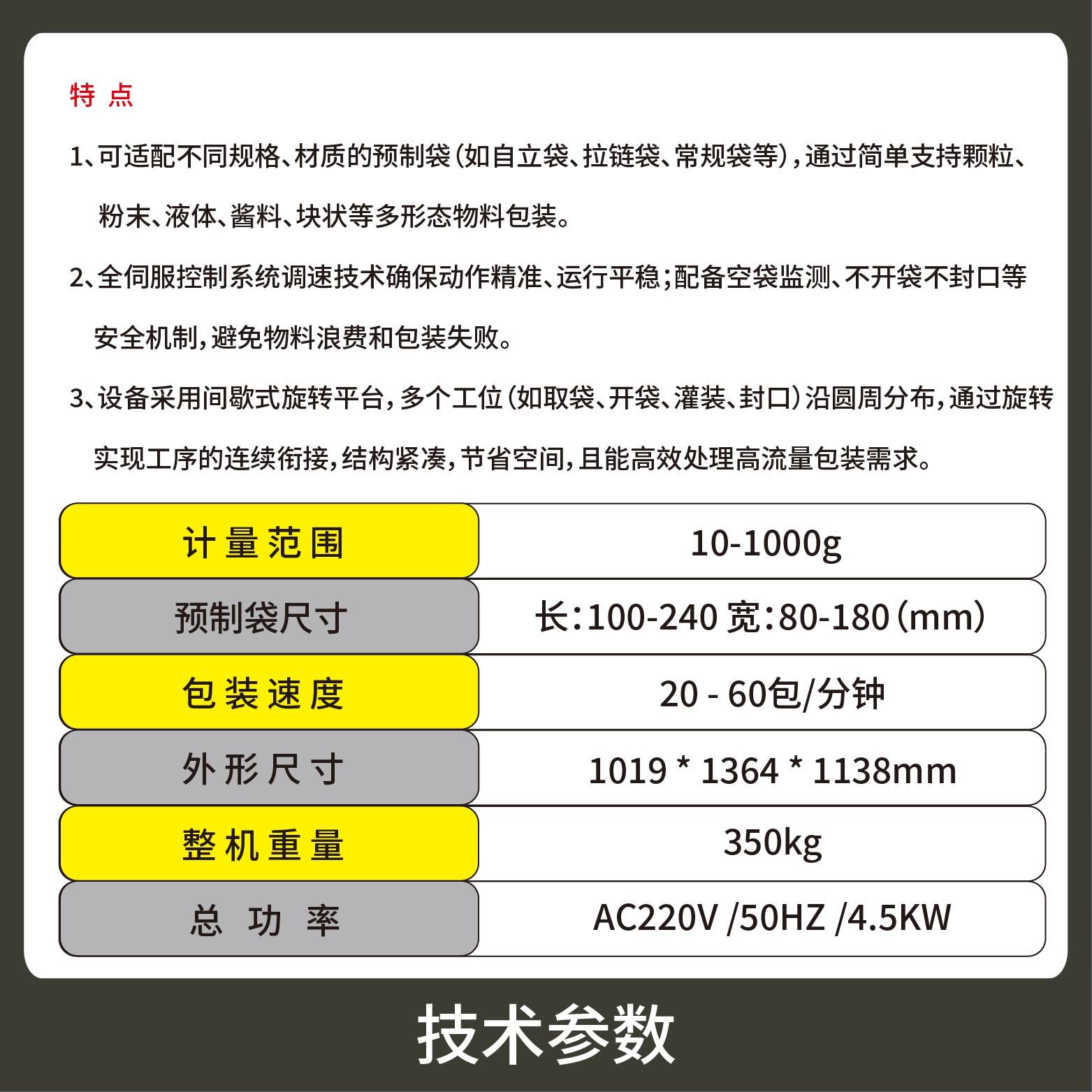 The machine adopts an intermittent rotating platform with multiple stations (bag feeding, bag opening, filling, sealing, etc.) distributed circularly. Continuous process connection is realized by rotation, with compact structure, space saving, and high efficiency for high-volume packaging requirements.
