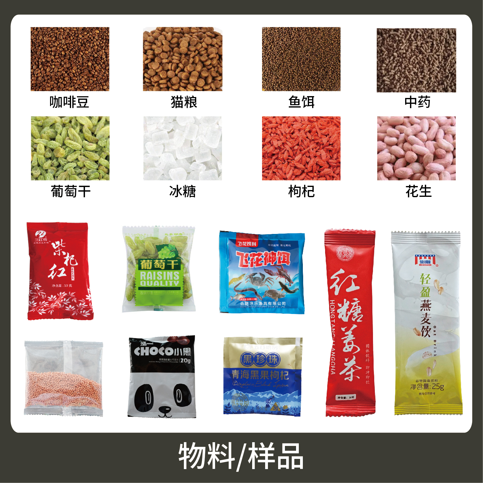 1、適用于食品、醫(yī)藥、化工、化妝品行業(yè)中顆粒物品的計量包裝,如:奶茶、咖啡、貓糧、狗糧等。